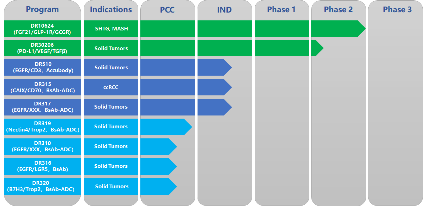 DR30206 is a trispecific fusion protein targeting PD-L1, VEGF, and TGF-β. It aims to treat tumors by blocking the PD-1/PD-L1 signaling pathway, neutralizing free VEGF and TGF-β, thereby restoring the proliferation of exhausted T cells, reducing tumor angiogenesis, and alleviating immunosuppression in the tumor microenvironment (TME). The TME of solid tumors is exceptionally complex, with multiple concurrent immunosuppressive pathways. The trispecific design of DR30206 is expected to improve the immune environment within the TME and enhance anti-tumor efficacy. Clinical trials of DR30206 in China were approved in June 2023, and multiple Phase Ib and IIa clinical studies are currently ongoing.