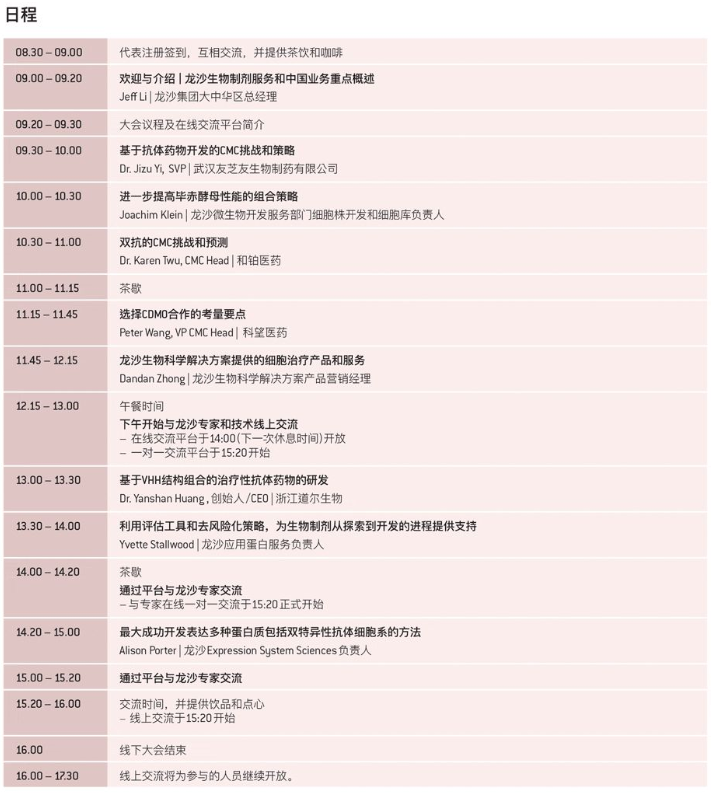 研讨会将有数位行业专家、生物技术公司创始人和龙沙的技术专家做精彩演讲。根据主办方的邀请和安排,黄岩山博士将在12日下午13:00-13:30就基于VHH结构组合的治疗性抗体药物的研发这个主题做专项报告。