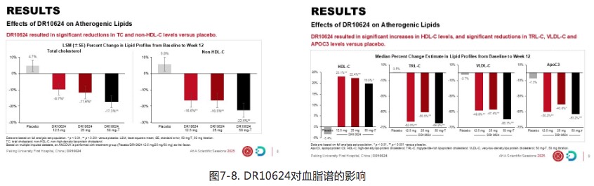 除此之外,DR10624也展现出极佳的改善致动脉粥样硬化的血脂谱的药效。相较安慰剂,DR10624的各剂量组都显著降低了总胆固醇(Total cholesterol)、非高密度脂蛋白胆固醇(Non-HDL-C)、富含甘油三酯的脂蛋白胆固醇(TRL-C,即残存胆固醇Remnant Cholesterol)、极低密度脂蛋白胆固醇(VLDL-C)、和载脂蛋白C3(ApoC3)。同时,DR10624显著升高了对心血管有益的高密度脂蛋白胆固醇(HDL-C)。