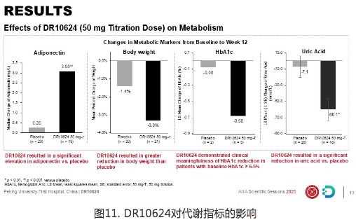 更令人欣喜的是,相较安慰剂组,DR10624 50 mg滴定剂量组在治疗12周后,可观察到脂联素水平的显著提升(提示对受试者的胰岛素敏感性有极大的改善)、尿酸水平的显著降低(对肾脏、心脏等器官都有益),以及降体重的药效。并且在基线HbA1c ≥6.5%的受试者中,可降低HbA1c水平0.68%(具有临床意义)。DR10624对受试者的代谢指标的综合性改善可归功于其独特的作用机制, 即三靶点激动活性。