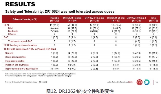 DR10624各剂量组在本研究中都展现出良好的安全性和耐受性。不良反应的严重程度主要为轻至中度。最常见的TEAE包括恶心、食欲改变和注射部位反应。