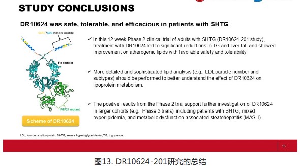DR10624-201研究的优异临床数据表明这款全球首创的靶向FGF21R、GCGR、GLP-1R的长效三激动剂,有望为重度高甘油三酯血症患者的治疗带来新希望!DR10624对于SHTG患者展现出了显著的综合改善代谢的疗效:在12周治疗期间内实现了高效且持续降低甘油三酯水平(最高达74.5%)、优化了多项致动脉粥样硬化脂质谱、快速高效地消除肝脏脂肪(最高达67%),以及多项代谢指标(脂联素、尿酸、体重、HbA1c等)的改善。其耐受性良好、安全性可接受,与药物相关的主要不良事件的严重程度多为轻至中度。这些积极的临床数据支持DR10624在未来开展更多大规模的3期临床试验,进一步探索其在SHTG、混合型高脂血症、及代谢功能障碍相关脂肪性肝炎等患者群体中的治疗潜力。