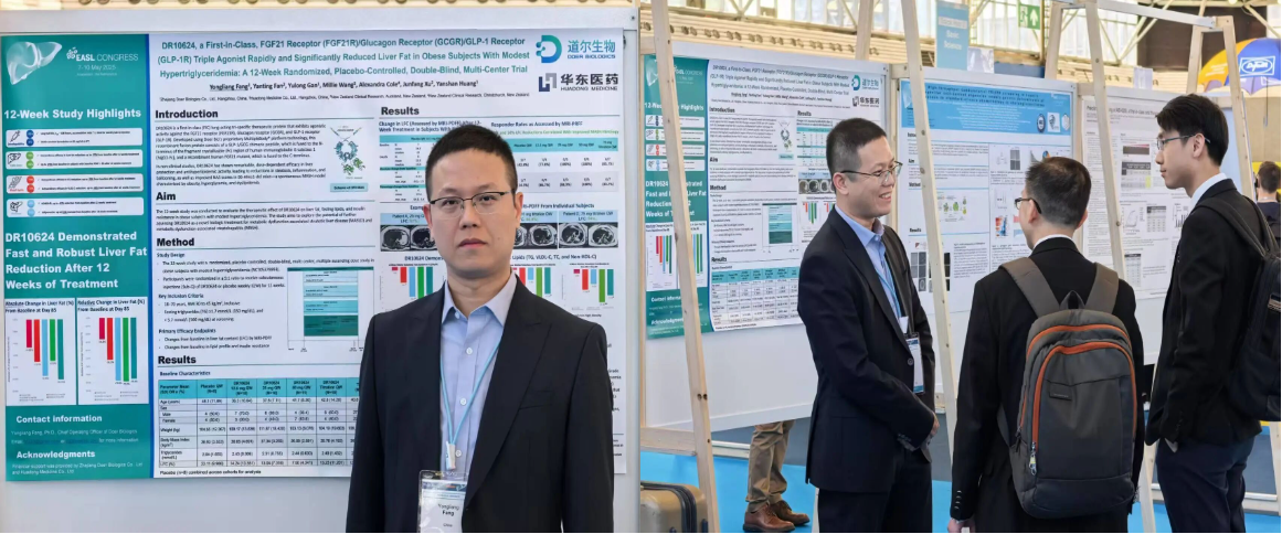 2025年5月7-10日,在荷兰阿姆斯特丹2025年欧洲肝病年会(EASL Congress 2025)上,在新西兰完成的1b/2a期临床研究结果“DR10624, a First-In-Class, FGF21 Receptor (FGF21R)/Glucagon Receptor (GCGR)/GLP-1 Receptor (GLP-1R) Triple Agonist Rapidly and Significantly Reduced Liver Fat in Obese Subjects With Modest Hypertriglyceridemia: A 12-Week Randomized, Placebo-Controlled, Double-Blind, Multi-Center Trial”入选了大会的最新突破(Late-Breaker),通过壁报(大会摘要号:LBP-003)的方式展示了DR10624在肥胖合并高甘油三酯血症受试者中取得的关键研究数据。