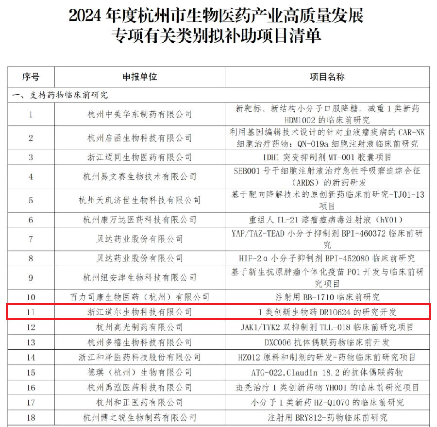 道尔生物的“Ⅰ类创新生物药DR10624的研究开发”项目本次成功入选“支持药物临床前研究”补助项目清单,首先要感谢杭州市科学技术局的认可与支持。能够获得杭州市科学技术局的资助,既是对道尔生物在生物医药创新领域不懈追求的肯定,也给公司未来发展提出了更高的要求。