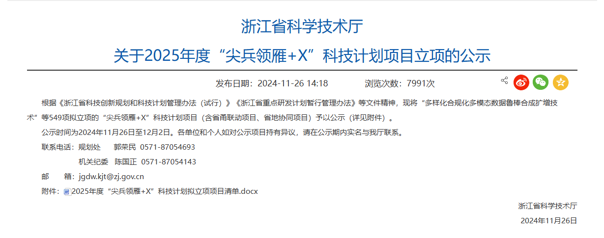 2024年11月26日,浙江省科学技术厅发布2025年度“尖兵领雁+X”科技计划项目拟立项的项目清单公示,道尔生物申报的研究项目“多特异性抗体/ADC药物开发”成功入选“尖兵领雁+X”计划中“新型抗体类药物研发”榜单。