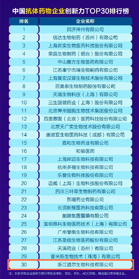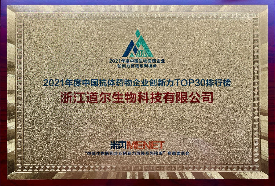 2022年9月16日,由米内网主办的"惟创新者行稳致远-2021年度中国生物医药企业创新力百强系列榜单"发布会于线上召开。道尔生物凭借其卓越的技术研发平台和产品管线,连续两年荣登"中国抗体药物企业创新力TOP30排行榜”。