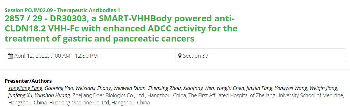 2022年4月4日,道尔生物将在美国路易斯安那州新奥尔良市举办的2022年美国癌症研究协会年会(AACR Meeting 2022)上以现场墙报形式(Poster Presentation)公布其基于SMART-VHHBody平台技术自主研发的靶向CLDN18.2单域抗体DR30303的临床前关键研究数据。
