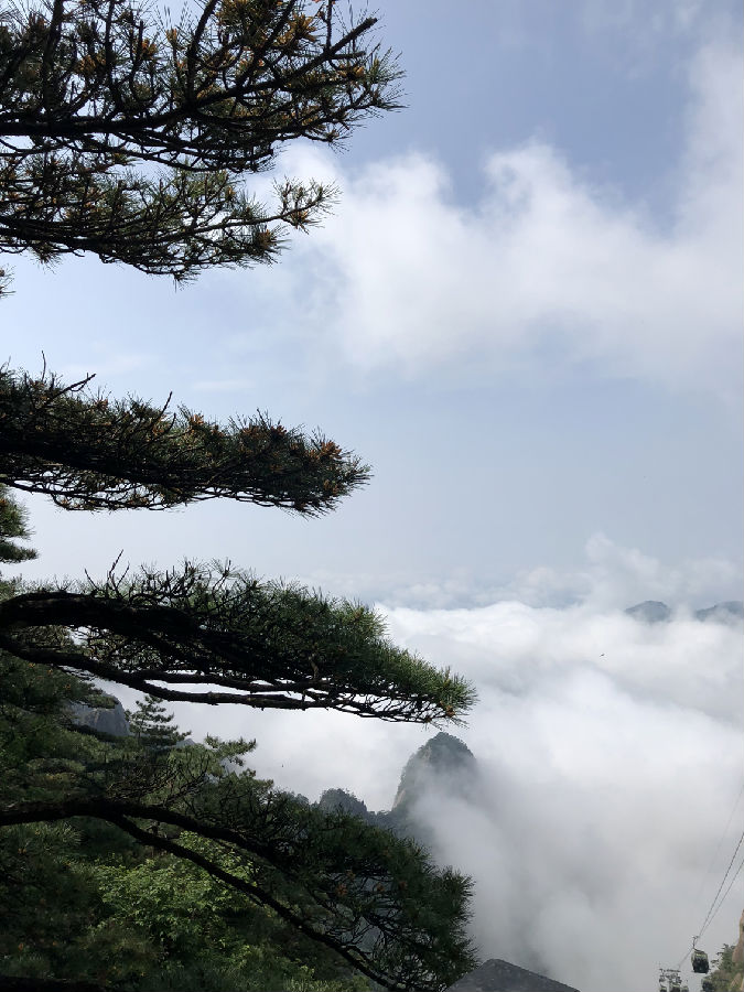 游览了壮阔的前山部分,之后就要欣赏下地势较为平缓一点的后山部分。黄山素以奇松、怪石、云海、温泉、冬雪“五绝”著称于世,而后山就是观赏奇松、怪石的妙处了。欣赏奇松、怪石则需要发挥充分的想象力,抽象的石块与姿态各异的松树,构成了祖辈们流传下来的传说:蓬莱三岛、猴子观海、梦笔生花、仙人晒鞋……伴着风景,我们走到了云谷索道站口,乘坐索道下山也意味着我们这次的黄山之旅也就渐入尾声了。