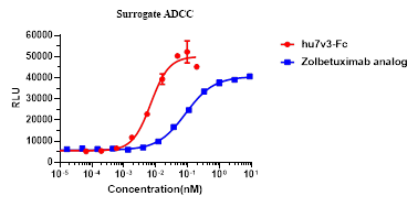 1)报告基因法及基于PBMC的杀伤活性表明,hu7v3-Fc 具有更高的抗体依赖的细胞杀伤活性(ADCC),分别为Zolbetuximab的12.4倍和82.7倍。