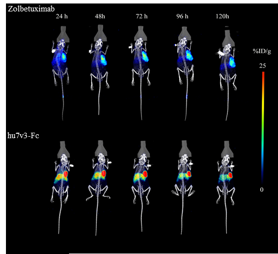 4)体内同位素示踪实验表明,hu7v3-Fc具有更高的肿瘤穿透及摄取能力。