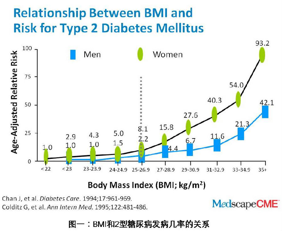 图一数据显示的是BMI指数和患2型糖尿病的几率的关系,从中可看出,对于男性来说,肥胖将使其比正常男性患2型糖尿病的几率增大将近8倍,从1.5%的患病几率增加到11.6%。而女性相对来说更易患T2DM, 肥胖女性比正常女性患T2DM的几率虽然同样增加8倍,但是患病几率却是从5.0%增加到40.3%。