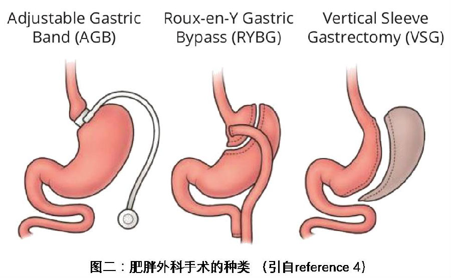 目前,对于伴有肥胖的2型糖尿病患者来说,最有效的治疗方案还是外科手术治疗(Bariatric Surgery,见图二),比如胃旁路手术(Gastric bypass surgeries),通过改变肠道结构和减少胃的空间和长度,关闭大部分胃功能,来治疗肥胖症,对肥胖的治愈率有效率可达99%。