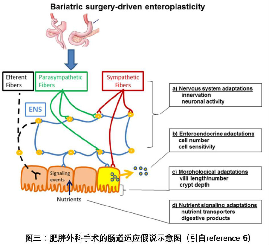 人们对肥胖外科手术的作用机理进行了大量研究,相应的研究结果给了我们很大希望。研究表明,这些良好效果并不是因为胃肠物理缩小或营养吸收不良引起的。这一结论最基本和直接的证据就是,经历过这种手术的人,饥饿感要比正常人差好多,哪怕他们的体重正在减轻。这和营养吸收不良的解释是完全相反的,因为按通常道理,胃消化和吸收被限制了,营养跟不上,只能消耗储存的能量,人们应该更容易感到饥饿才对。进一步研究发现,实行此手术后,血液循环系统中肠道激素的分泌水平发生了很大变化,比如说胰高血糖素样肽-1(glucagon-like peptide-1, GLP-1), 胃泌酸调节素(oxyntomodulin),成纤维细胞生长因子-19(fibroblast growth factor-19,FGF19),胰高血糖素(glucagon,GCG),胃饥饿素(Ghrelin)等等。如我们所知,体内的能量平衡不单单是有肠胃来控制的,而是由中央神经系统和肠胃系统一起合作控制的。大脑和肠胃协同进化的优先方向就是使能量利用达到很好的平衡,不浪费也不短缺。肠道激素就是肠胃系统和中央神经系统沟通的一类介质。美国密西根大学的Randy J. Seeley和同事提出了肠道适应假说(图三)来解释肥胖手术治疗的良好疗效背后的机理。