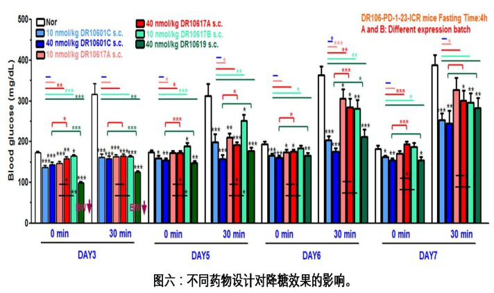 DR10619不但具有很好的减肥效果,在降糖效果上同样有优异表现。 如图六所示,在小鼠IPGTT试验中,DR10619与dulaglutide相似的降糖药效,而且具有更为持久的降糖药效,其降糖效果可以持续到第7天。
