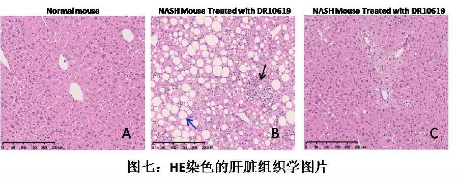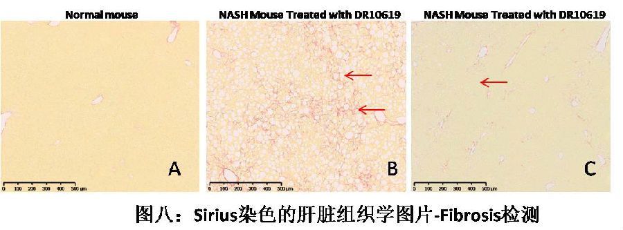对于由于肥胖引起的非酒精性脂肪肝疾病(NAFLD)或者非酒精性脂肪变性肝炎(NASH),DR10619也表现出了很好的疗效。图七中A是正常小鼠的肝脏组织学图片(HE染色),B是ADCC诱导的NASH小鼠的肝脏组织学图片,可以发现诱导后的NASH小鼠表现出了明显的肝细胞脂肪变性(蓝色箭头)和炎细胞浸润(黑色箭头)现象。但是,经过DR10619治疗后(图C),我们可以发现脂肪变性和炎细胞浸润现象消失了,图C和图A看起来几乎没有什么差别。NASH是NAFLD的一种,是病情恶化的一种,即肝炎。这种肝炎可以导致肝脏中纤维化的形成。这也是区分一般NAFLD和NASH的一种方式。图八是利用Sirius Red染色形成的肝脏组织学图片,从中我们可以看到模型NASH小鼠有很明显的肝脏纤维化(Fibrosis)现象形成(图八-B)。而经过DR10619治疗后,可以发现纤维化现象几乎完全消失了(图八-C),进一步证明了DR10619对于NAFLD/NASH的良好治疗效果。