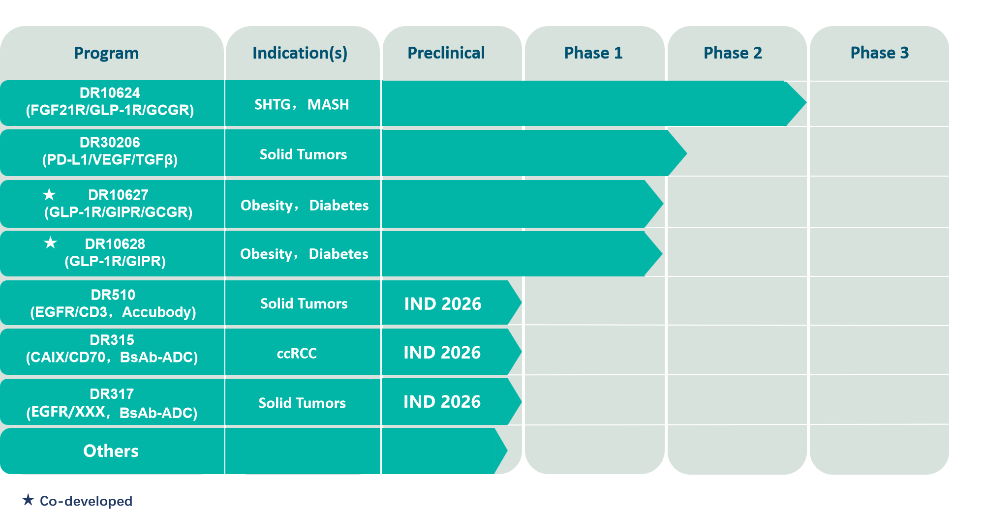 DR10628是将具有GLP-1R/GIPR双效激动活性的多肽与长链脂肪酸链交联而获得的产物。在临床前动物试验中,DR10628呈现极其显著的降糖和减重药效。适应症为肥胖、糖尿病和MASH等代谢疾病。DR10628在中国的临床试验于2023年4月获批,目前已完成I期临床研究。