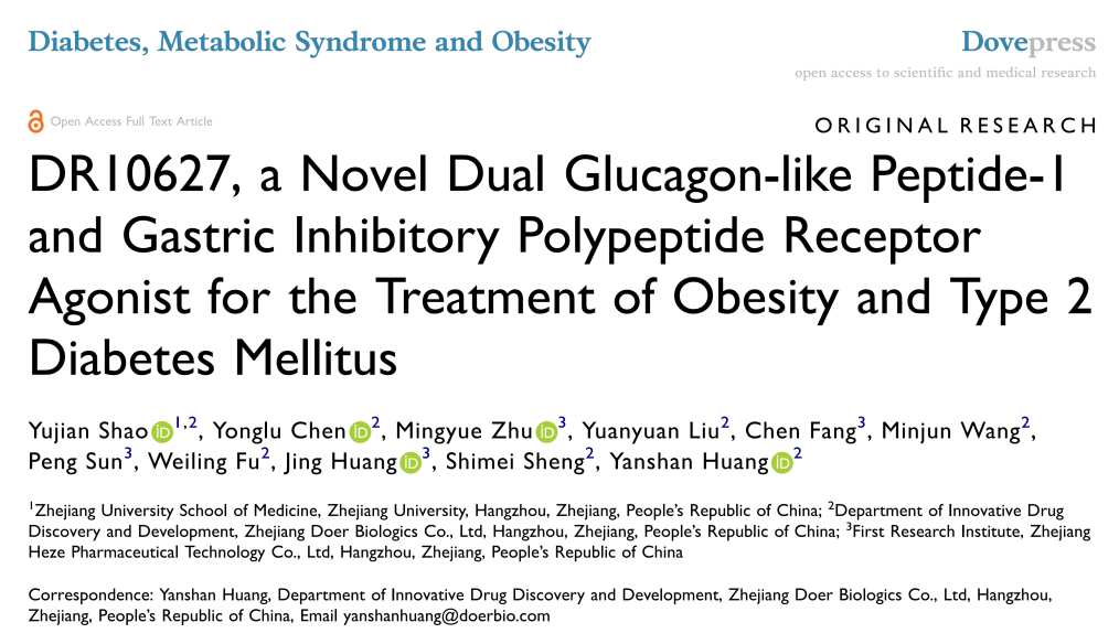2024年4月5日,浙江道尔生物科技有限公司和浙江和泽医药科技股份有限公司合作研发的新型GLP-1R/GIPR双激动剂DR10627的临床前研究结果在Diabetes, Metabolic Syndrome and Obesity(JCR lmpact Factor:2022年为3.3, 近5年平均为3.6)上发表,题为“DR10627, a Novel Dual Glucagon‑like Peptide‑1 and Gastric Inhibitory Polypeptide Receptor Agonist for the Treatment of Obesity and Type 2 Diabetes Mellitus”,浙江道尔生物创始人/CEO黄岩山博士为本文的通讯作者。